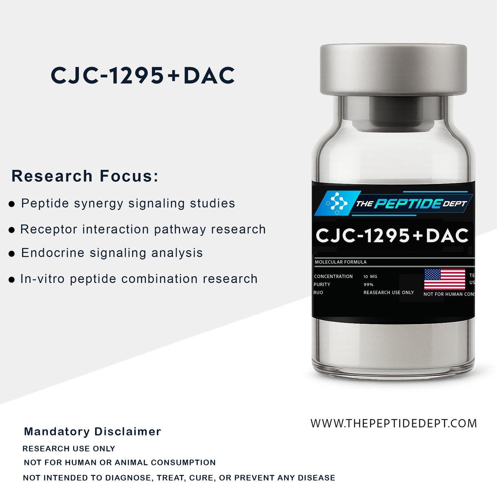 CJC-1295 with DAC is a synthetic peptide compound supplied exclusively for laboratory research use. This product is intended for qualified researchers conducting controlled experimental and analytical studies in regulated laboratory environments. Each batch is supported by quality documentation to verify identity and purity. Not intended for human or animal consumption, clinical use, diagnostic use, or therapeutic applications.
